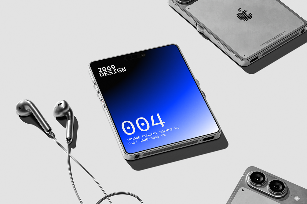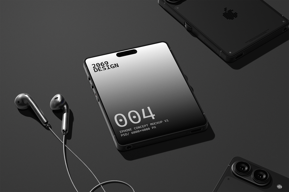 A bold, reimagined iPhone concept with a 4:3 screen ratio and industrial proportions — designed for creators who want futuristic, cinematic visuals that stand apart from standard device mockups.
