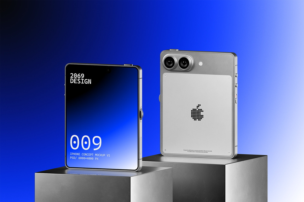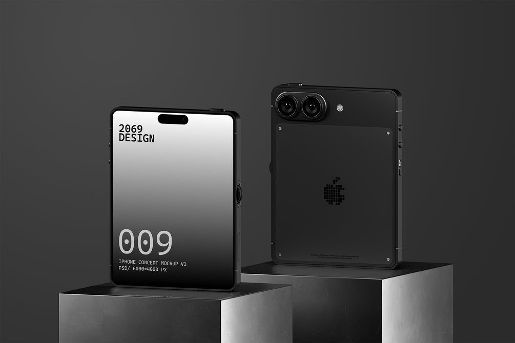 A bold, reimagined iPhone concept with a 4:3 screen ratio and industrial proportions — designed for creators who want futuristic, cinematic visuals that stand apart from standard device mockups.